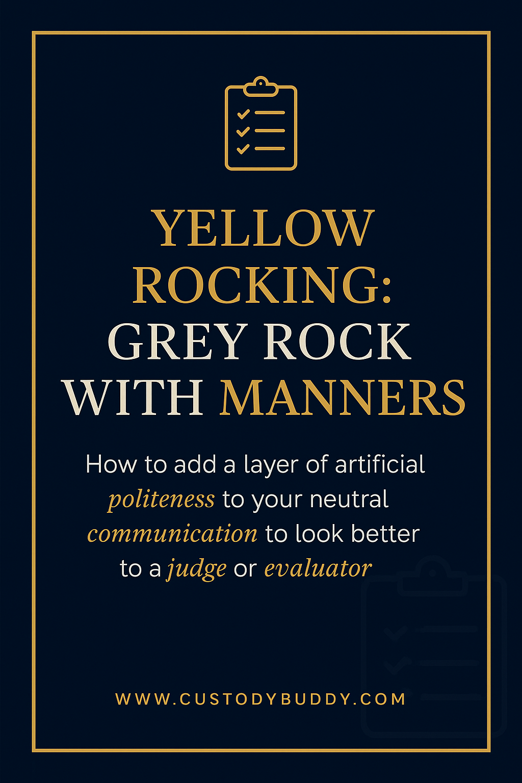 Enter Yellow Rocking — the fancy cousin of Grey Rock, with a splash of artificial politeness thrown in. It’s like Grey Rock’s makeover episode that sends it to charm school. Because when you’re up in front of a judge or evaluator, looking like a calm, polite human (not just a blank stone) can really tip the scales in your favor.